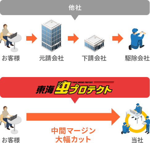害虫・害獣駆除を業者に依頼する際、仲介業者を挟むと、どうしても中間マージンが発生し、費用が高くなりがちです。また、仲介業者を挟むことで、お客様の要望が現場の作業員に正確に伝わらない可能性もございます。